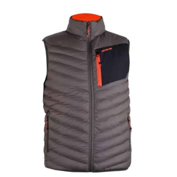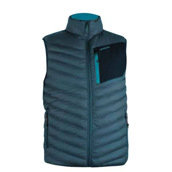 Cremallera central y bolsillos delanteros con cremallera invertida, bolsillo en el pecho bicolor de plástico, protector de barbilla, ribete elástico en el bajo, logo de silicona.