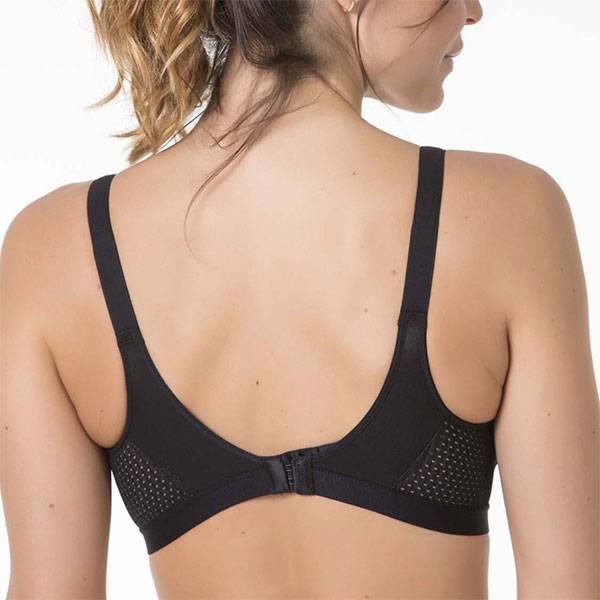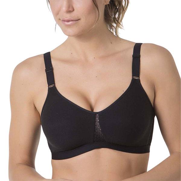 Este sujetador está desarrollado con materiales naturales hipoalergénicos para sentir un máximo confort al contacto con la piel. Tejido doble prehormado de algodón, con tirante acolchado de ajuste delantero. Laterales con malla abierta transpirable.