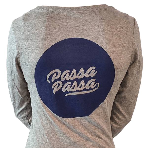 Camiseta manga larga de mujer color gris con dibujo frontal azul marino.